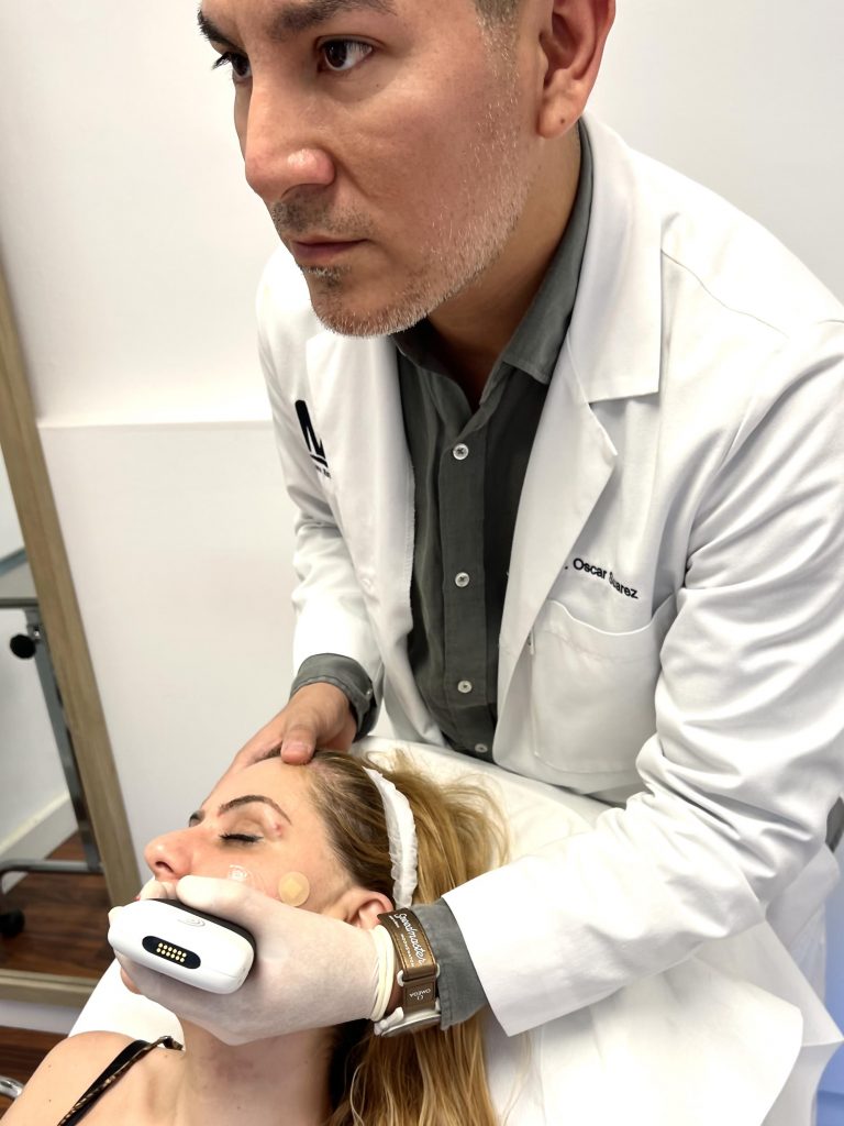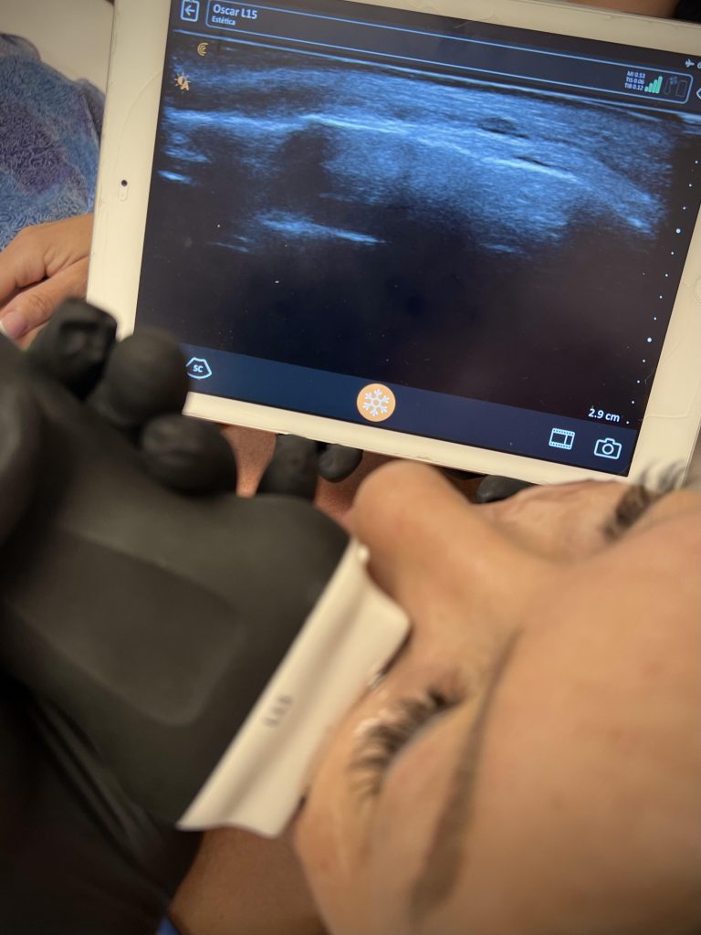 La ecografía es hoy por hoy una herramienta fundamental para hacer los tratamientos más seguros. Así mismo nos permite hacer un mapeo vascular, visualizar estructuras sensibles y diagnosticar materiales inyectados previamente en el rostro.